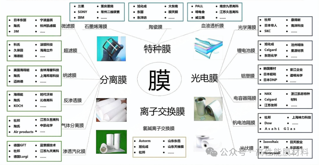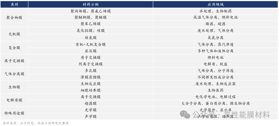根据材料特性和应用领域可以将高性能膜分为聚合物膜、无机膜、复合膜、离子交换膜、气体分离膜、生物膜、电解质膜和特殊用途膜,具体材料示例和应用情况如下:
